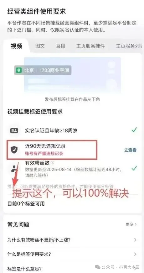 抖音显示“近90天无违规记录,账号有严重违规记录”不符合,无法视频、直播带货怎么办?一招快速解决!