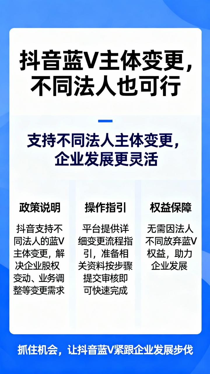 总之,2026年抖音蓝V主体变更的规则更清晰,同法人和不同法人场景各有操作重点,只要提前准备好对应材料,遵循平台流程,就能顺利完成变更。如果对材料准备或操作步骤有疑问,建议先咨询平台客服,避免走弯路。